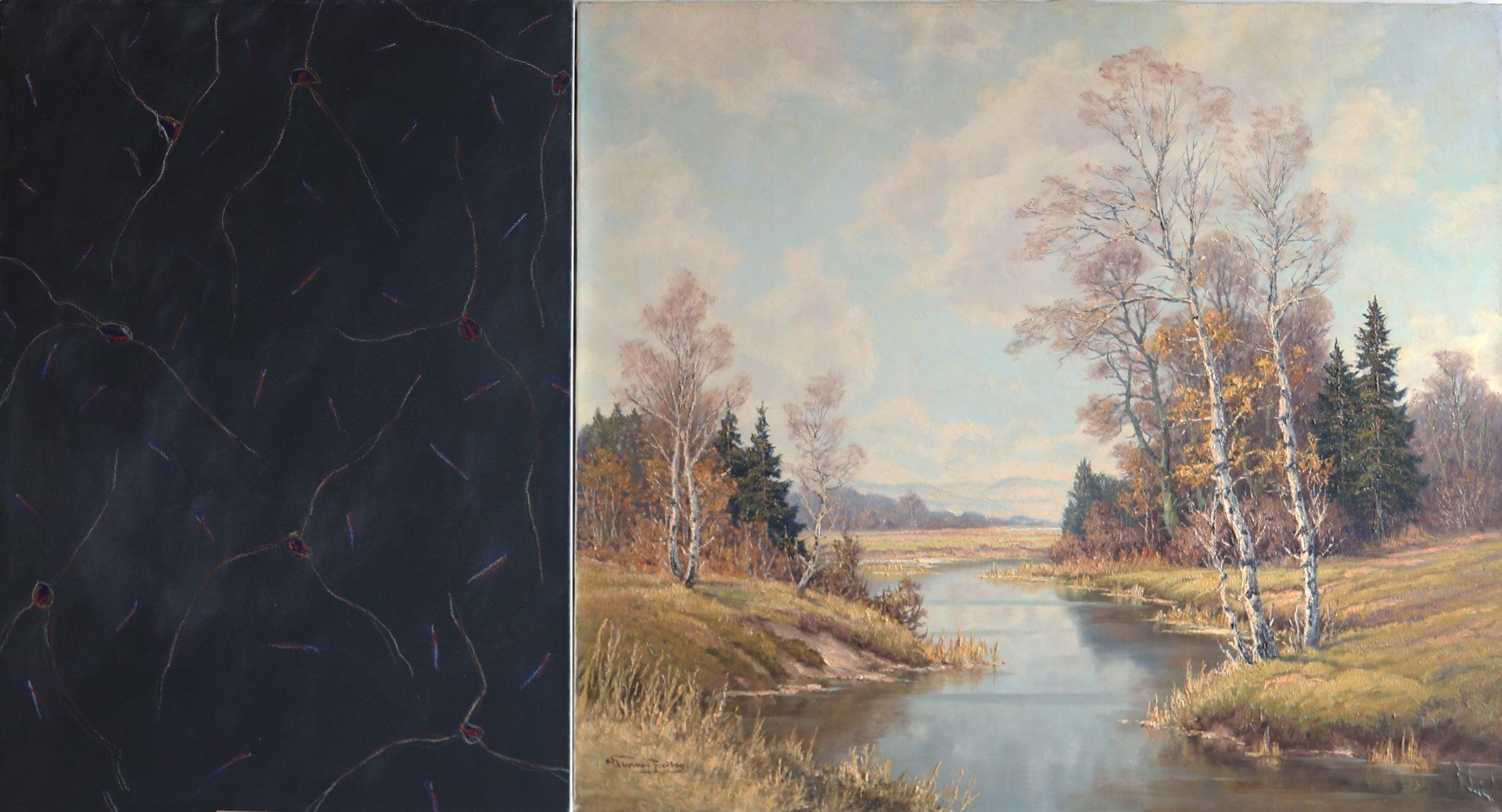 Trotz dieser spezifischen Geschichte habe ich später Freitags Gemälde abgelehnt, weil es aus studentischer Sicht ein Synonym für das Traditionelle, Gestrige, Dekorative und Bürgerliche darstellte und erst heute im Zuge einer eigenen Werkrückschau eine, wenngleich auch bewusst emotional und unwissenschaftlich geführten, Auseinandersetzung mit dem Leitmotiv Clemens Freitags, den Flusslandschaften, sinnhaltig werden lässt. Gerade die langen Jahre der nahezu ausschließlichen Beschäftigung mit gegenstandsfreier Kunst ließ die eigene Bildsozialisation fast in Vergessenheit geraten, auch im elterlichen Wohnzimmer hingen längst echte Hansmanns.