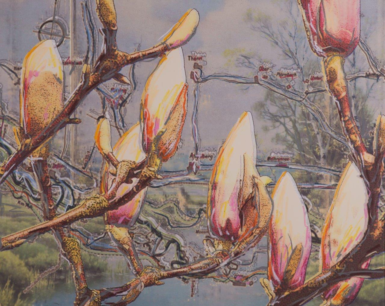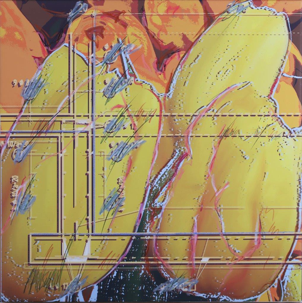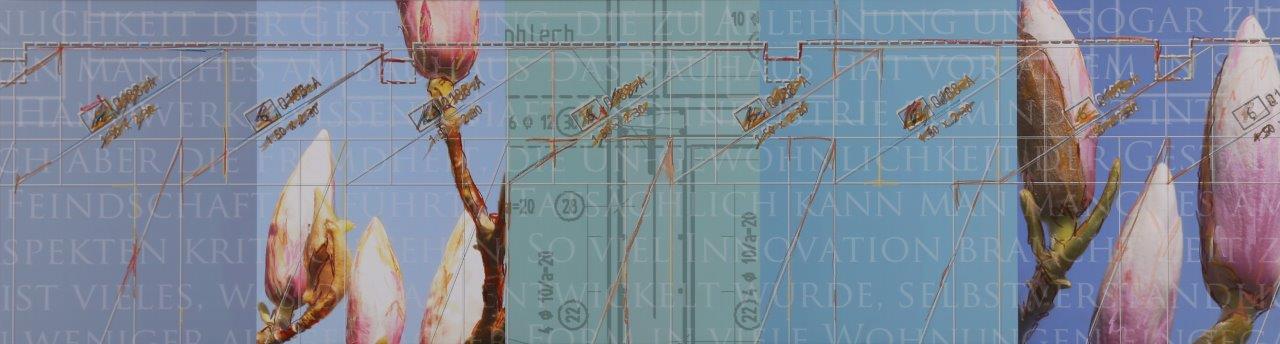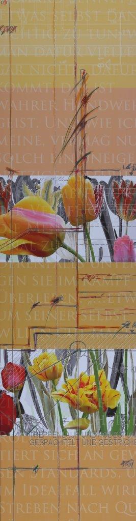 In den öffentlichen Bereichen des Gebäudes finden sich die Blumenbilder und schaffen für Mitarbeiter und Besucher eine positive Einstimmung. Die floralen Motive sind in der Kunst ein oft behandeltes Thema und bilden häufig Allegorien oder symbolisieren bestimmte Eigenschaften und Zusammenhänge. Die hier gewählten Blüten von Tulpe, Begonie, Wicke, Magnolie, Pfingstrose und Hortensie gehören zu den in unserem Kulturkreis verbreiteten und beliebten Zierpflanzen, die in der alltäglichen Wahrnehmung positiv besetzt sind und sich großer Wertschätzung erfreuen. Die Blütendarstellungen im Rahmen der Bildwerke bilden nicht vorrangig das Dingliche ab, sie beschreiben die Schönheit der Pflanzen nicht objektiv durch eine genaue Darstellung, sondern sie sind aus einem subjektiven Blick heraus durch die emotionale Stimmung der Farbigkeit mehrschichtige Seherlebnisse. Diese sinnliche Ebene wird mit mehreren Bildelementen kontrastiert. Teilweise erweitern Textpassagen das Bild, die das Handwerk im weitesten Sinne thematisieren und definieren eine enge Beziehung zum konkreten Ort, dem Berufsbildungs- und Technologiezentrum.