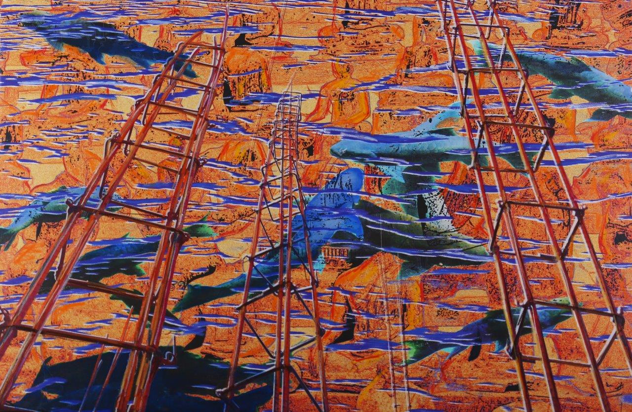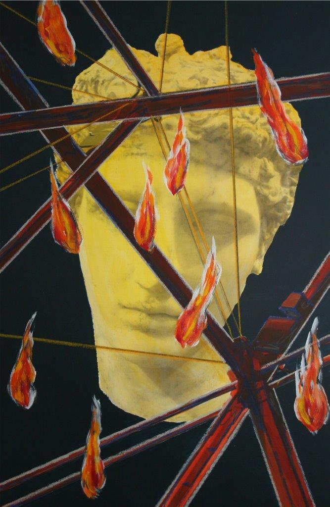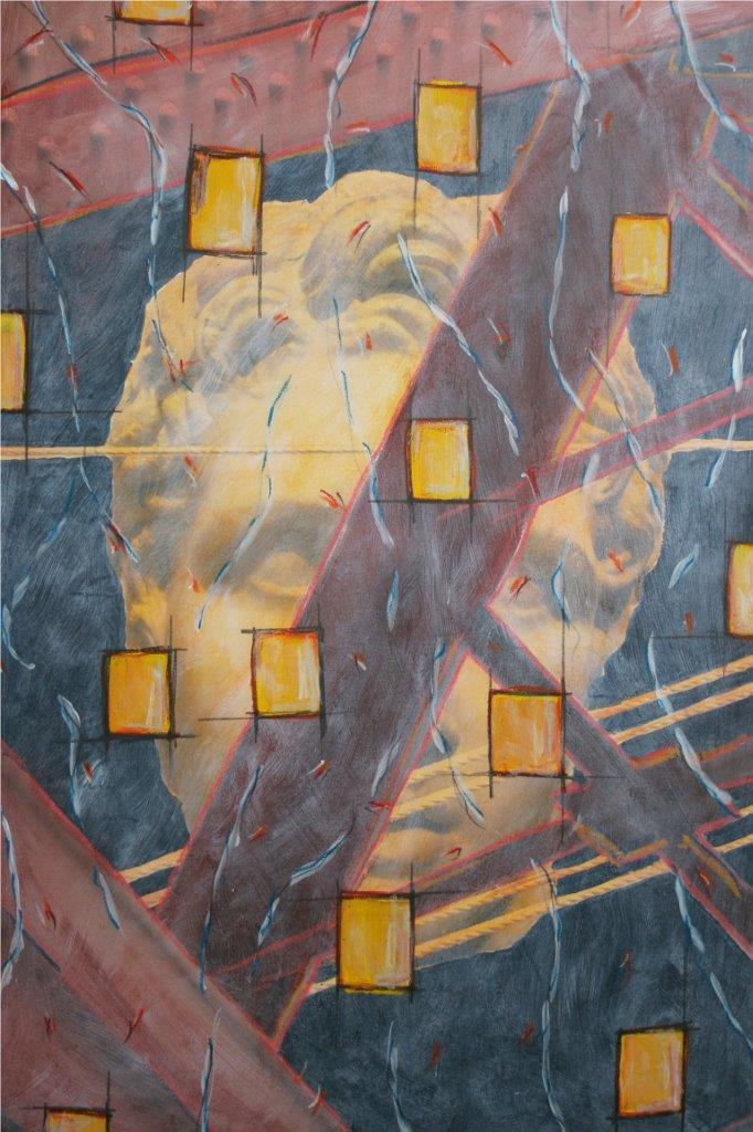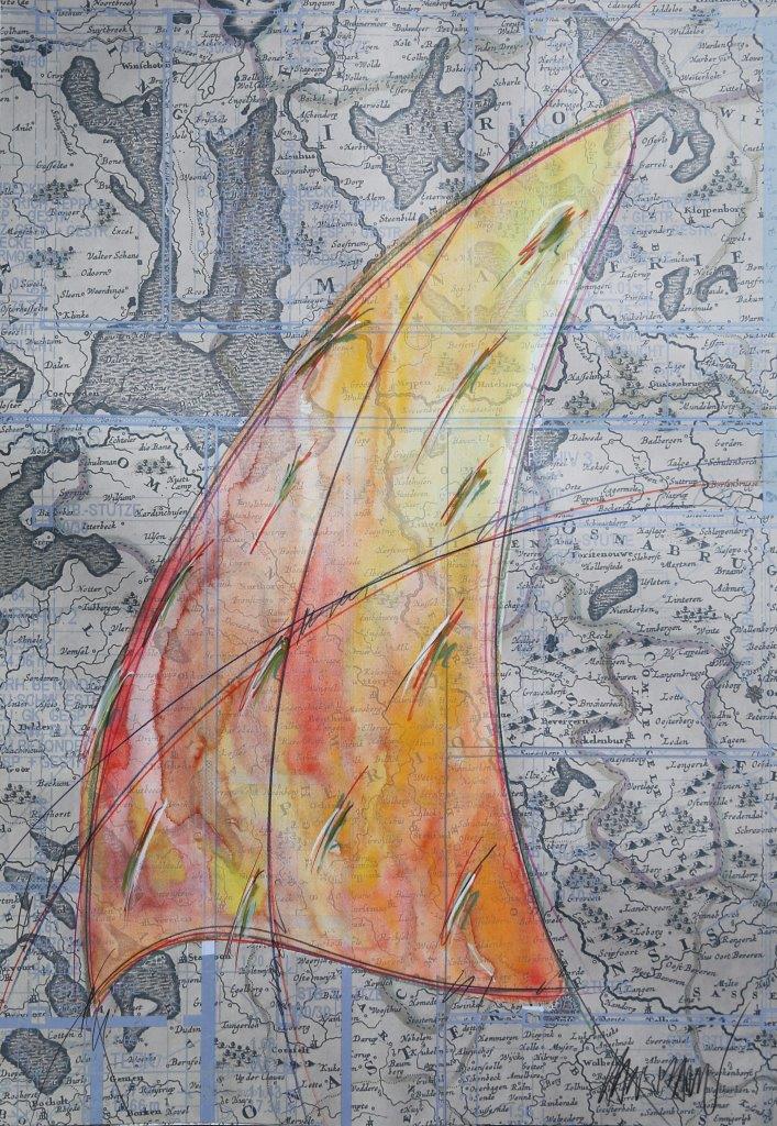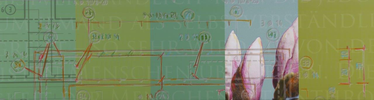 Dieselbe Suche nach dem persönlichen Standpunkt im räumlichen Kontext regen die benutzen Pläne des Gebäudes an, sodass hier zwei Koordinatensysteme übereinander die subjektive Sicht des Einzelnen verdeutlichen. ber diese Bildebenen spannen sich volle Segel, die scheinbar im Wind stehen und Bewegung suggerieren, eine Bewegung, die die aktive Auseinandersetzung im individuellen Reflektieren schafft. Die je unterschiedlichen Kolorationen entsprechen den unterschiedlichen emotionalen Dispositionen, die das menschliche Sein kennzeichnen und ohne die jede Rationalität kraftlos wäre.