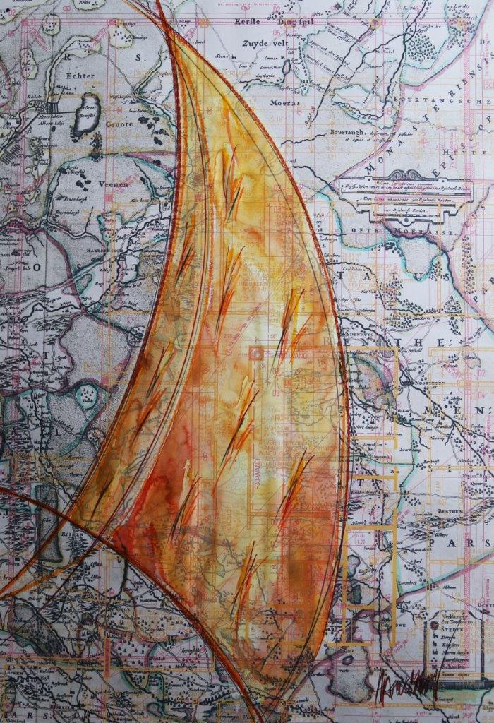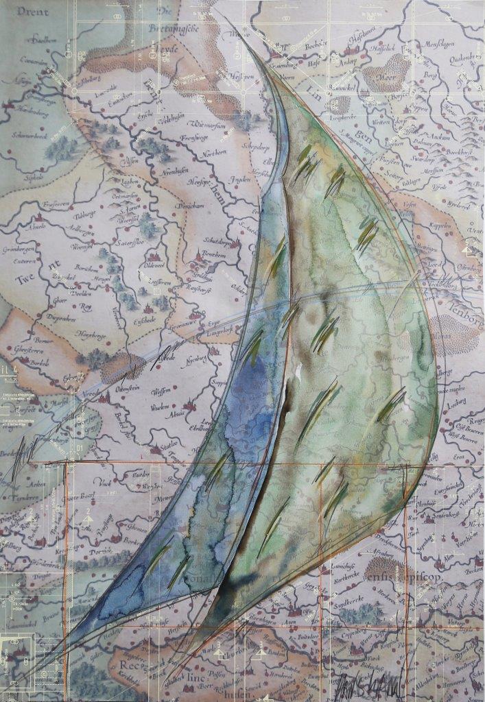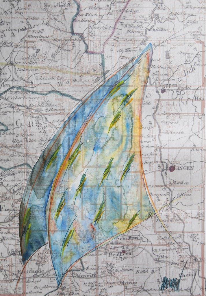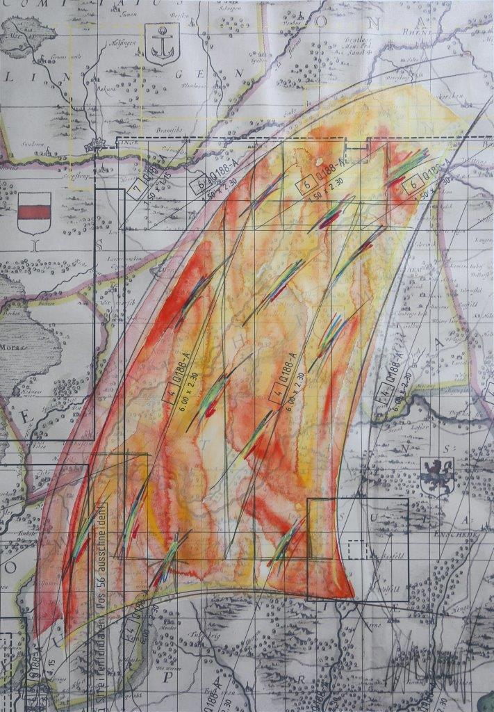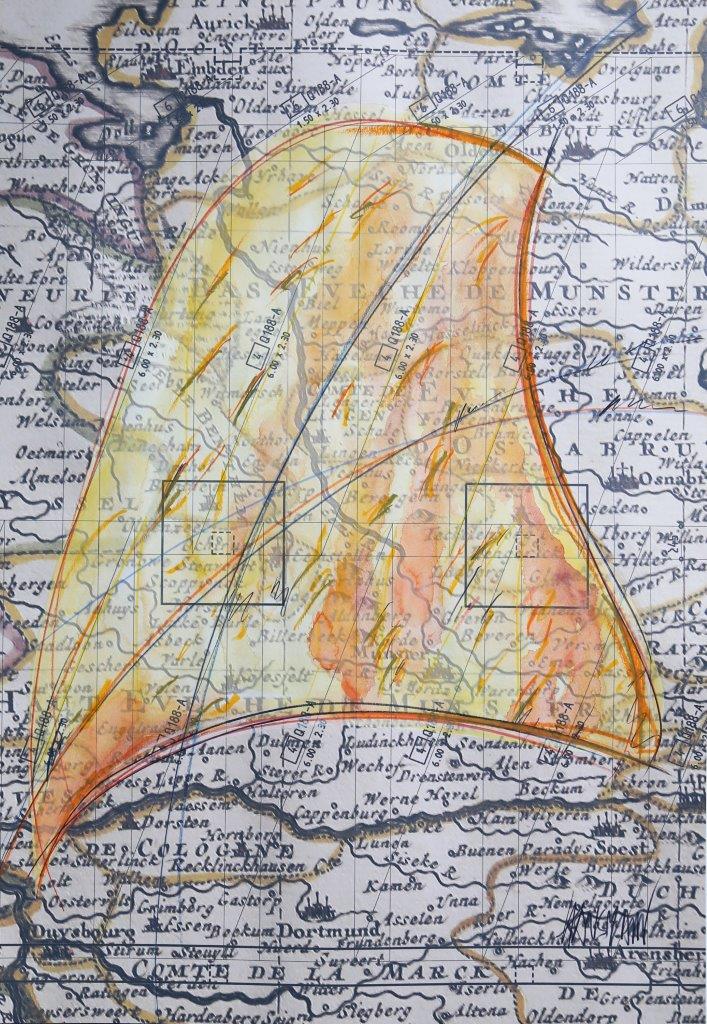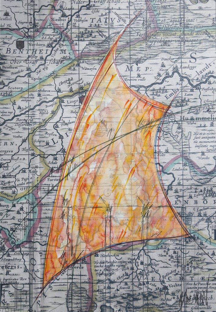 In den Büros befinden sich zwölf Bilder, die jeweils drei Bezugsfelder miteinander kombinieren. Die Basis bilden unterschiedliche historische Landkarten der Region, die zwischen dem 16. und 18. Jahrhundert angefertigt wurden, Ausschnitte aus den Architekturzeichnungen des Gebäudes sowie gemalte Segelflächen, die sich über den Bildgrund zu spannen scheinen. Die Karten beziehen sich auf die Historie der Region. Die Grafschaft Bentheim und das Emsland lagen als überwiegend landwirtschaftlich geprägte